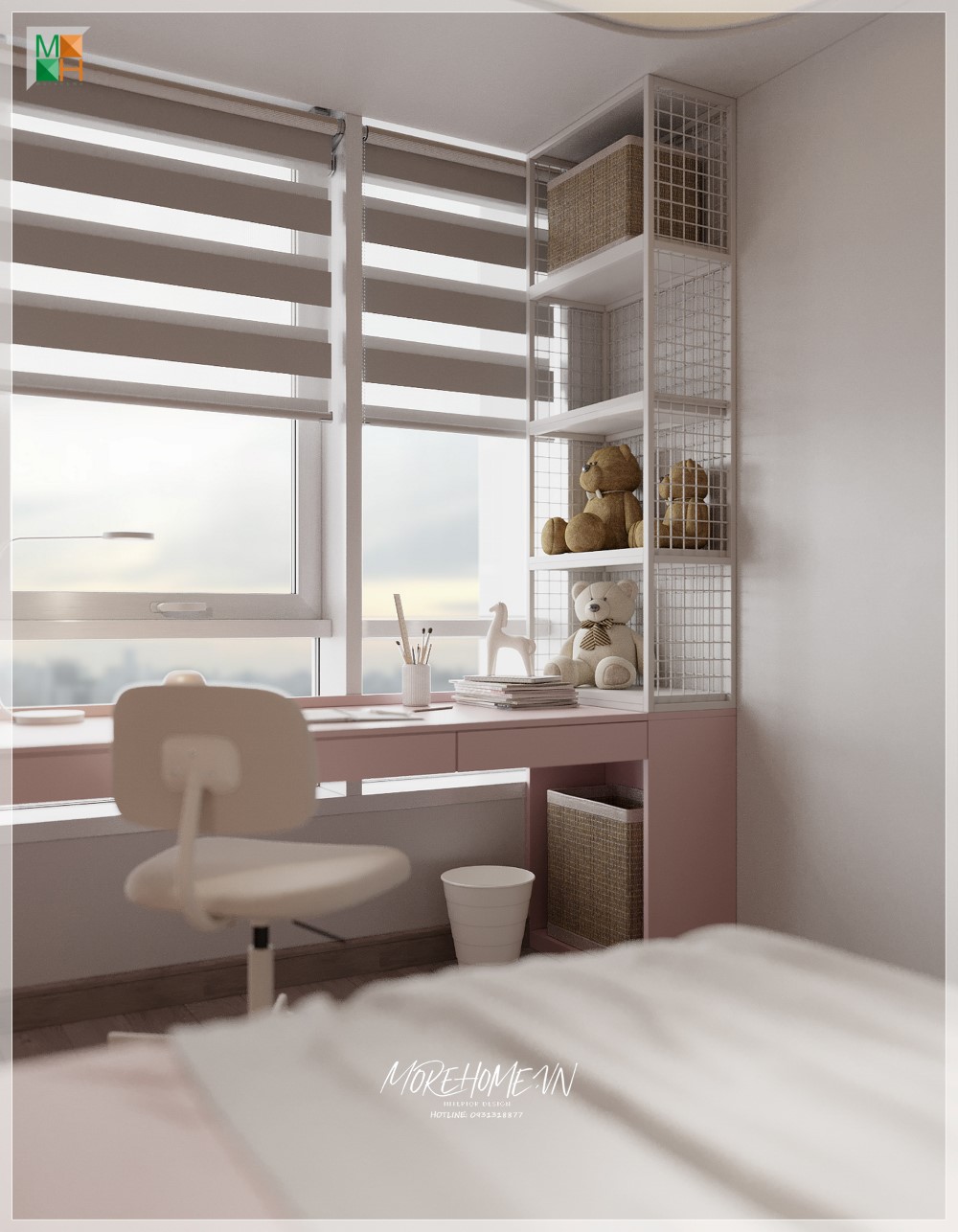 Bàn học gỗ công nghiệp có kệ tủ đồ tiện lợi cho sử dụng, đồ đạc sắp xếp trình tự, ngăn nắp
